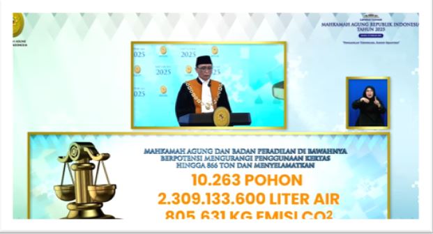 Dakam penanganan perkara berbasis ecourt, Mahakamah Agung dan Badan Peradilan Di Bawahnya berpotensi mengurangi penggunaan kerta hingga 866 ton dan menyelamatkan 10.263 pohon, 2.309.133.600 liter air dan 805.631 Kg emisi Co2.